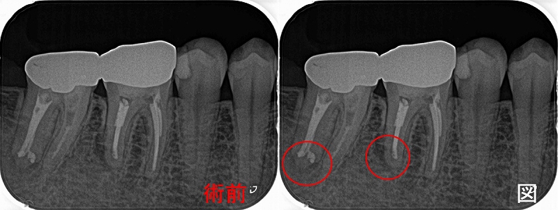 第2大臼歯は近心根付近にパフォレーション(人工的な穴)がありました。