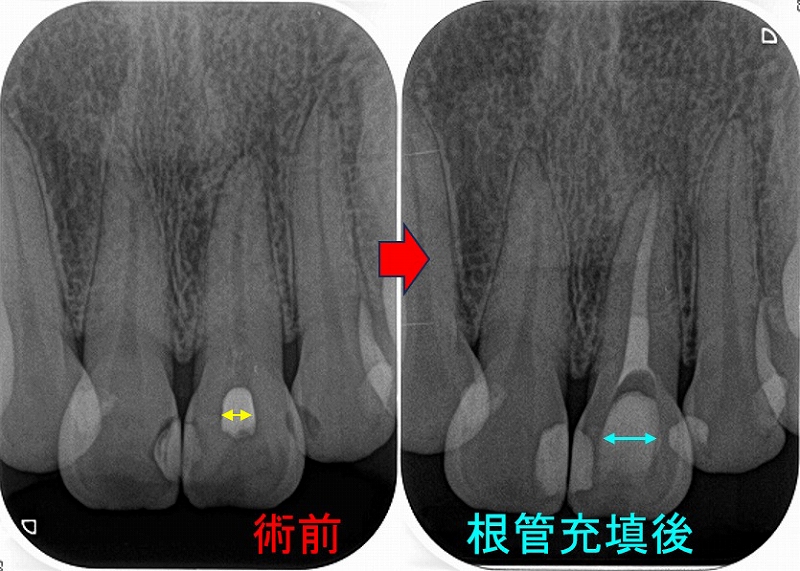 根管は手付かずで石灰化も起こっていなかったので、運よく根尖まで穿通&形成&消毒できました。