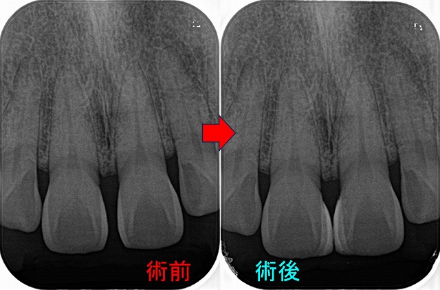 また左上2の側切歯も気になる透過像があるものの、電気歯髄診断では多少反応がある為矯正治療中の歯根膜の肥厚と判断し、側切歯は様子をみることにしました。