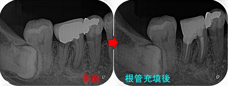 この歯は2回法で根管治療+レジンコア+レジン充填まで